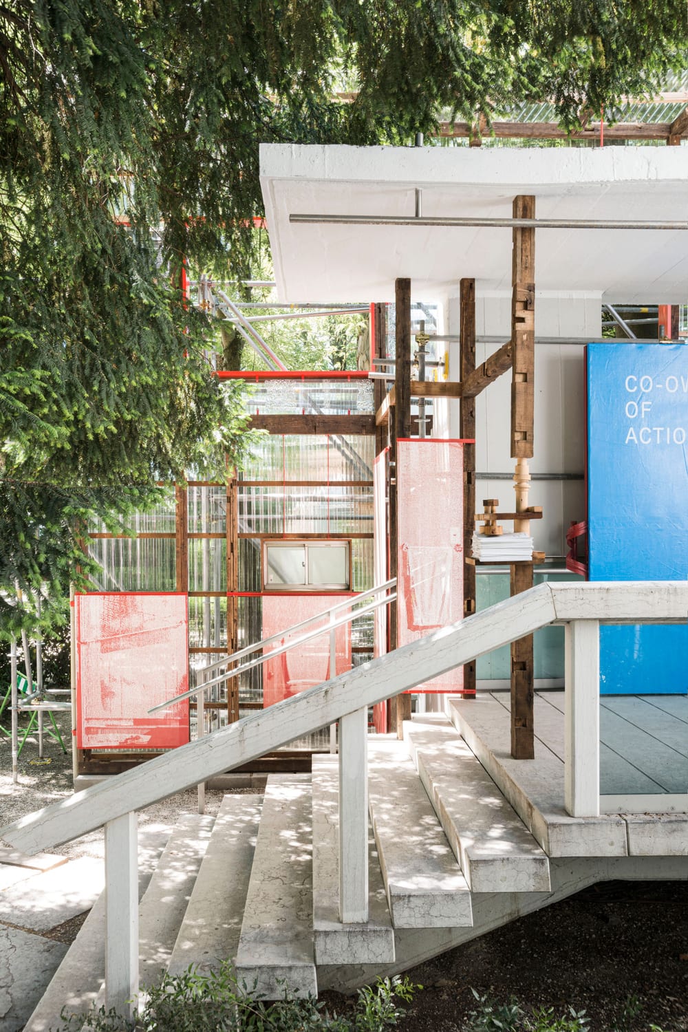 Materials discarded during demolition were replaced with locally available alternatives. For example, the rust-proof corrugated metal cladding on the facade was substituted with large clear polycarbonate sheets sourced from an Italian hardware store, while wallpaper and flooring patterns were scanned and reproduced on transparent panels or plywood.