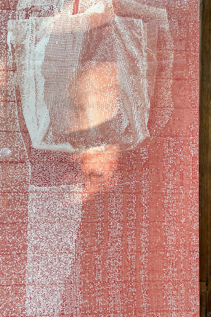 トイレやそこにかかっていたタオル、階段室の雑多な生活用品などを再現するため、解体前に撮影された3D点群スキャンデータをもとに立面投影画像を作成し、メッシュ素材の膜に印刷している。