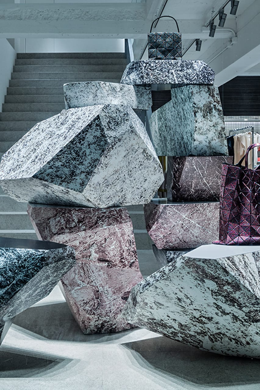 BAO BAO ISSEY MIYAKEの店舗ディスプレイのための、「かみのいし(Paper Stone)」(中山英之 + 砂山太一)シリーズによるインスタレーション。ウィンドウ/店内に「かみのいし」を積層・配置し、商品を載せる台座でありながら空間全体を風景として立ち上げた。