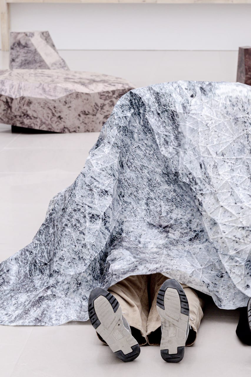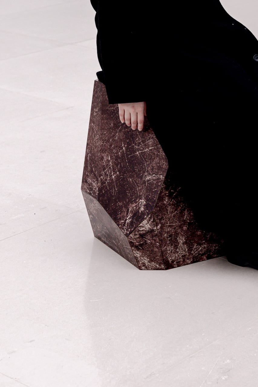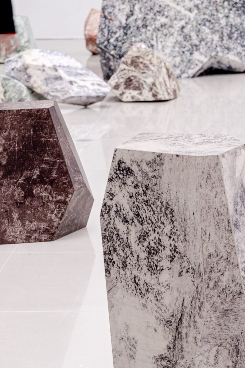 Since 2017, architect Hideyuki Nakayama and Taichi Sunayama (SUNAKI) have collaborated on the “Kami no Ishi” (Paper Stone) project. Presented in the Toyota Municipal Museum of Art exhibition Neko no Hosomichi, the work takes as its subject stones that resist both scale and stable meaning. Starting from six ordinary pebbles, the artists combine styrofoam modeling and digital analysis to produce polyhedral 3D models, which are unfolded, printed on paper, and assembled into sculptures.