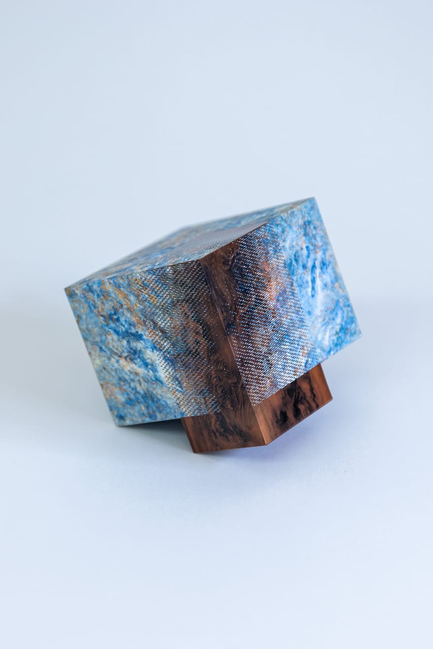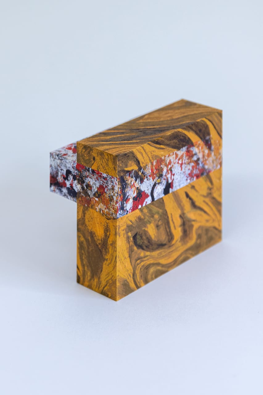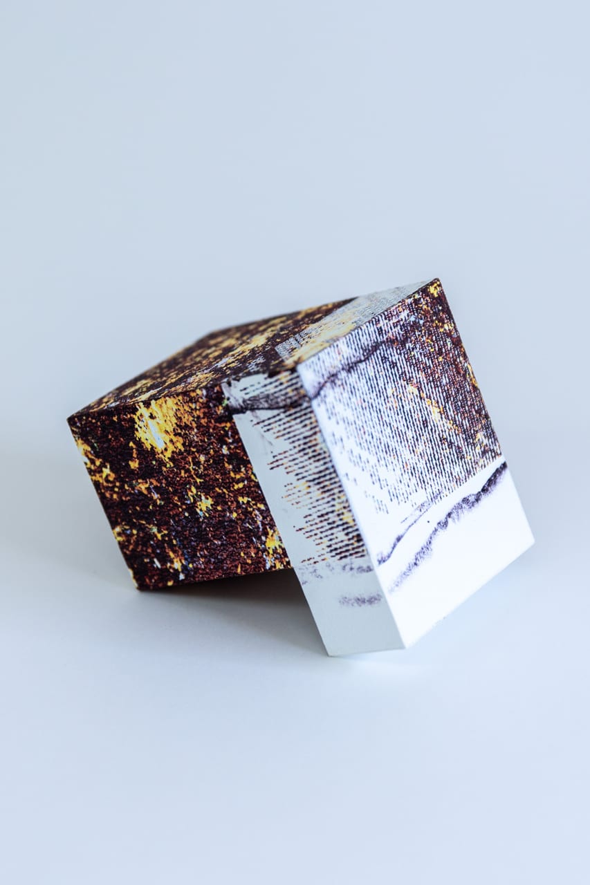 Z-fightingとは、デジタル3D空間上で二つのオブジェクトが重なることで発生するテクスチャ表示のバグを指し、通常は避けられるべきものとされている。一方、このプロジェクトでは、このバグをあえてわたしたちが感じるデジタル特有の手触りとして捉え、バーチャルな現象を、物質的な世界にそのまま持ち込んだ紙のオブジェクトを作成した。異なるテクスチャを持つ二つのボックスが重なり合ったデジタル上の3Dモデルを作成し、そこで引き起っているバグを現実世界で忠実に再現するため、シルク印刷や紙加工など旧来からの印刷における職人技術に加え、一点一点手作りで最終的な仕上げをおこなっている。