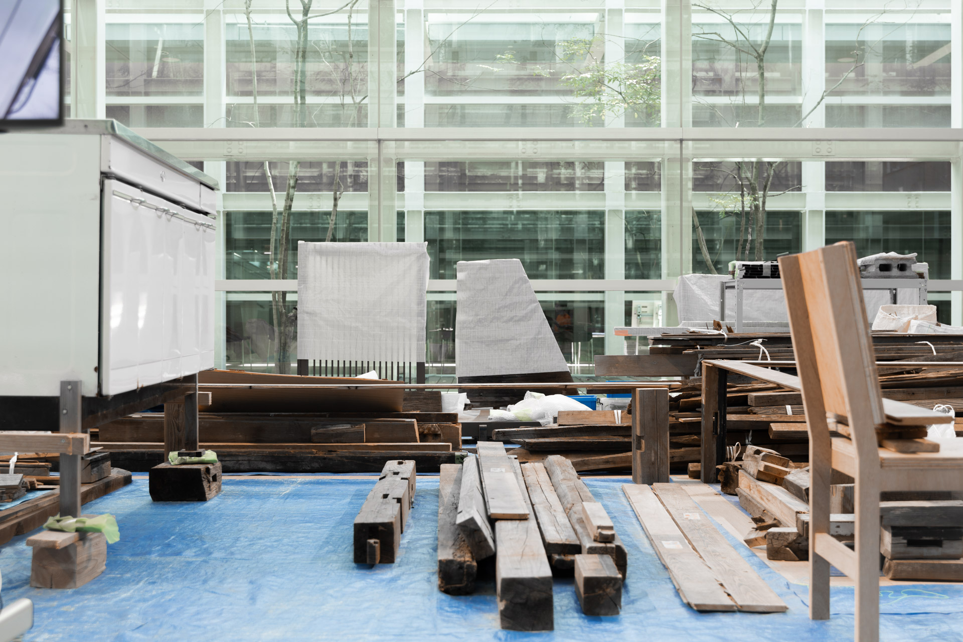 On the exhibition floor, the layout of the house that was the dismantling site was recreated using blue tarps. Additionally, instead of preparing architectural mechanisms to fix fixtures, a performance was held where a person would carry the fixtures and stand them in their designated positions every thirty minutes. The exhibition was designed with the core idea that it is not a static display but dynamically changes through human labor, emphasizing that humans actively compose the space.