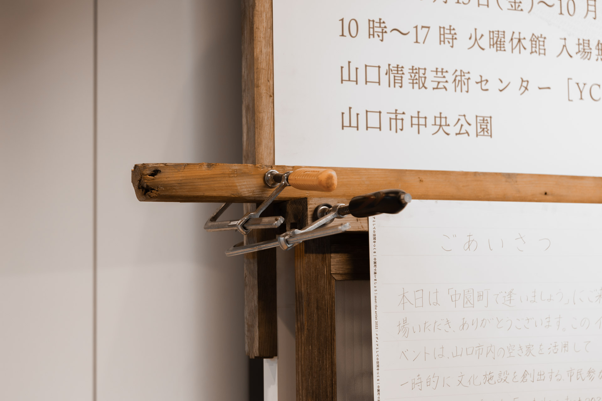 山口情報芸術センター[YCAM]が2022年より行ってきた「meet the artist 2022: メディアとしての空間をつくる『中園町で逢いましょう』」の成果報告展の空間デザイン。山口市内の空き家を《ゆっくり解体》することで生まれる空間的・時間的余剰を活用し、一時的に文化施設を創出するプロジェクト。その成果報告展では、それまでの記録映像や、廃材から市民の手によって作り出された箸や茶わんなどの新たな日用品を展示するほか、材の釘抜や切断など解体現場の「労働」をそのままYCAMの展示室内でも継続させることを企図された。